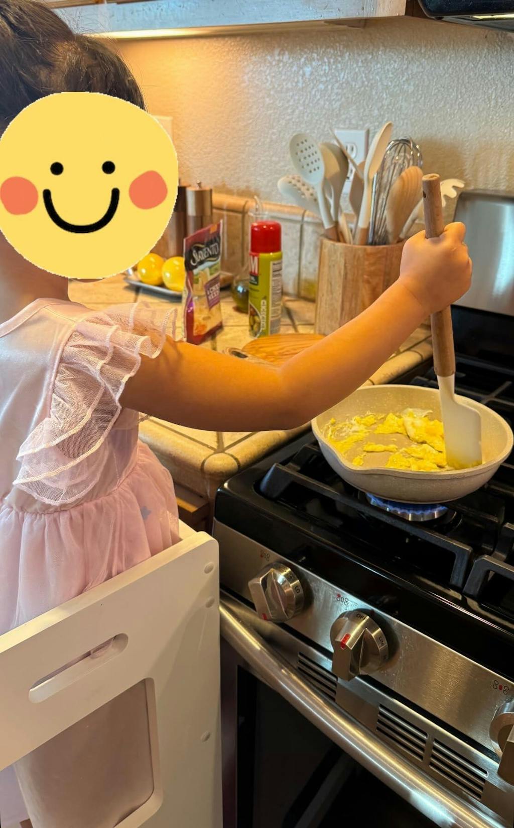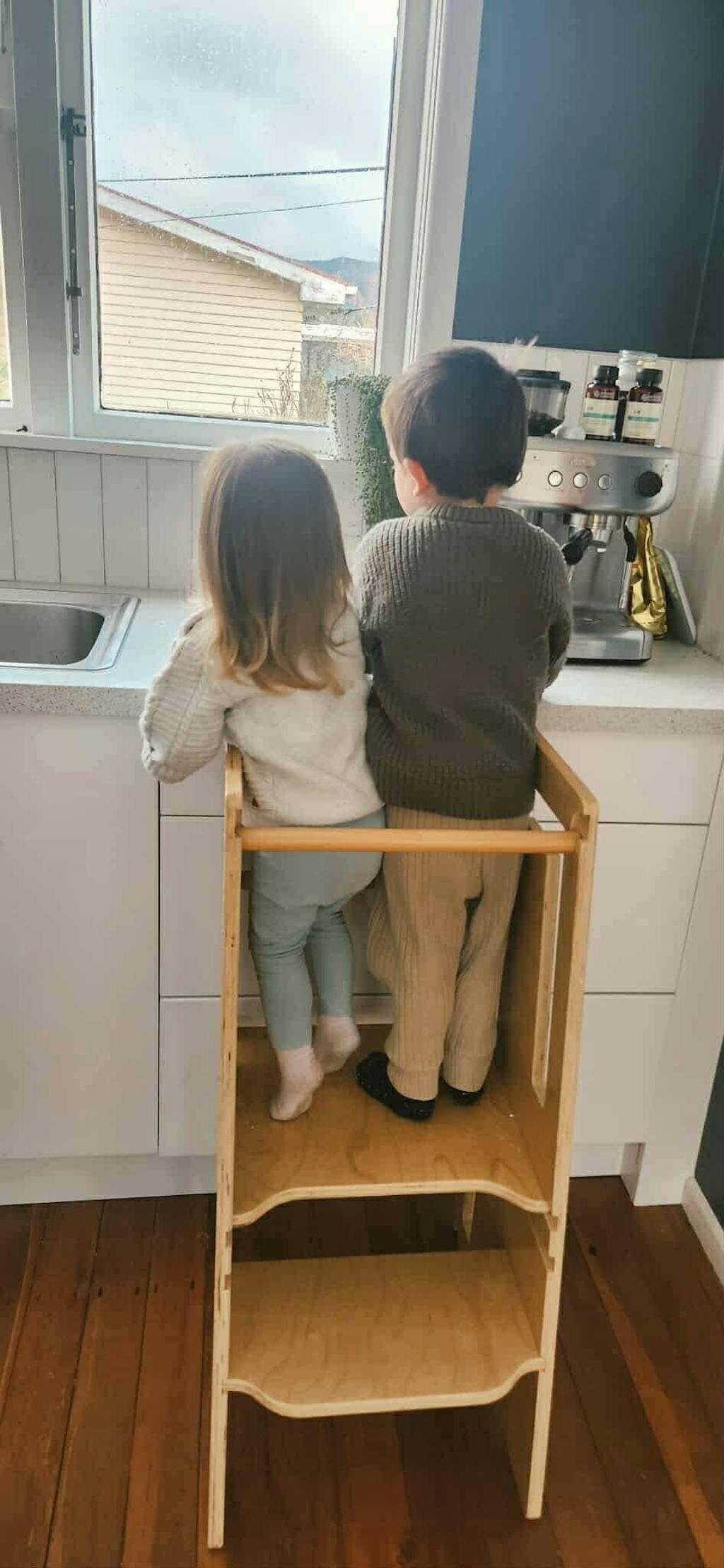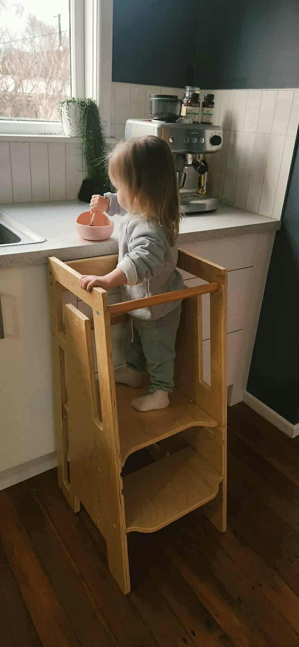 We love this standing tower! Our 4 year old is obsessed with helping mummy cook breakfast, lunch and dinner and this has been the best purchase to help her learn basic skills in the kitchen. Very sturdy and well made. Love the color and the safety bar that prevents kids from falling backwards. Putting it together was super easy. Definitely get your money’s worth!