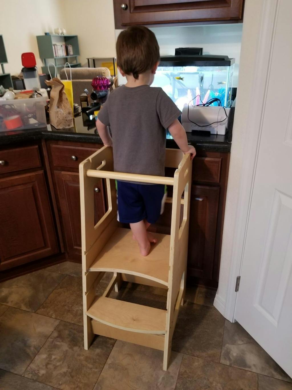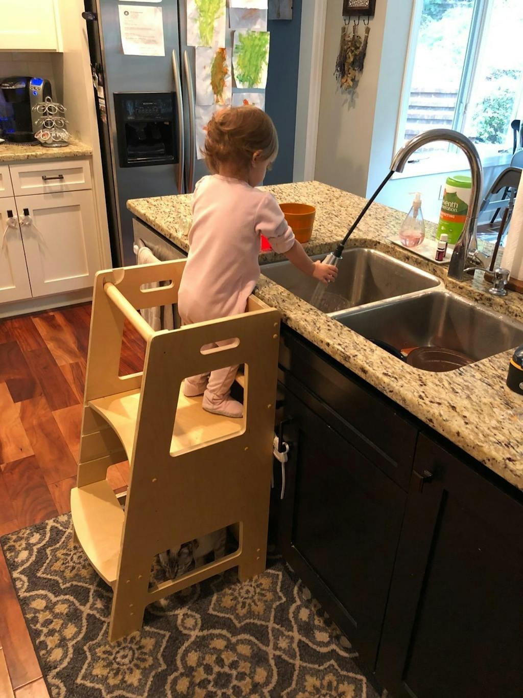 Granddaughter loves being able to be at the counter and help. Washes dishes and helps cook. Loves to eat snack at the counter. She just turned 18 months and can easily climb up into and down from by herself